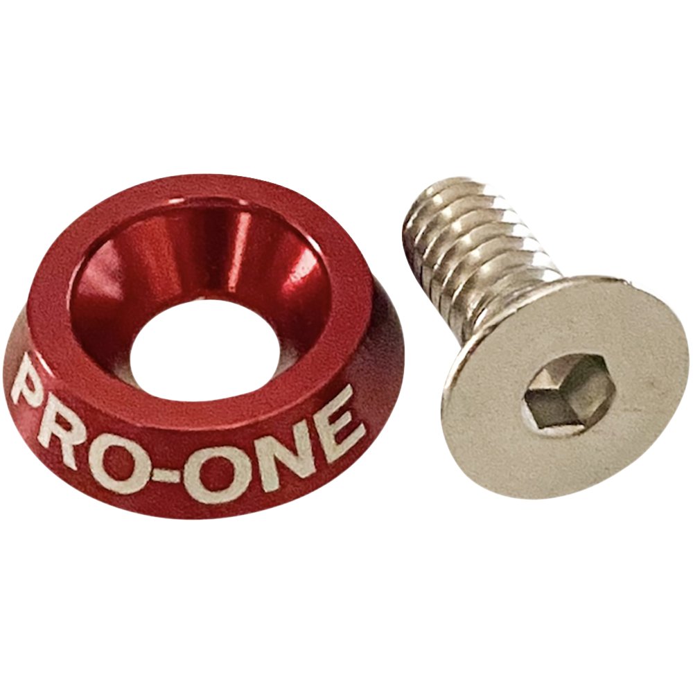 Chrome 1/4"-20 bolt seated in an anodized beauty washer with Pro-One logo, Fits Harley-Davidson models with 1/4"-20 seat screw